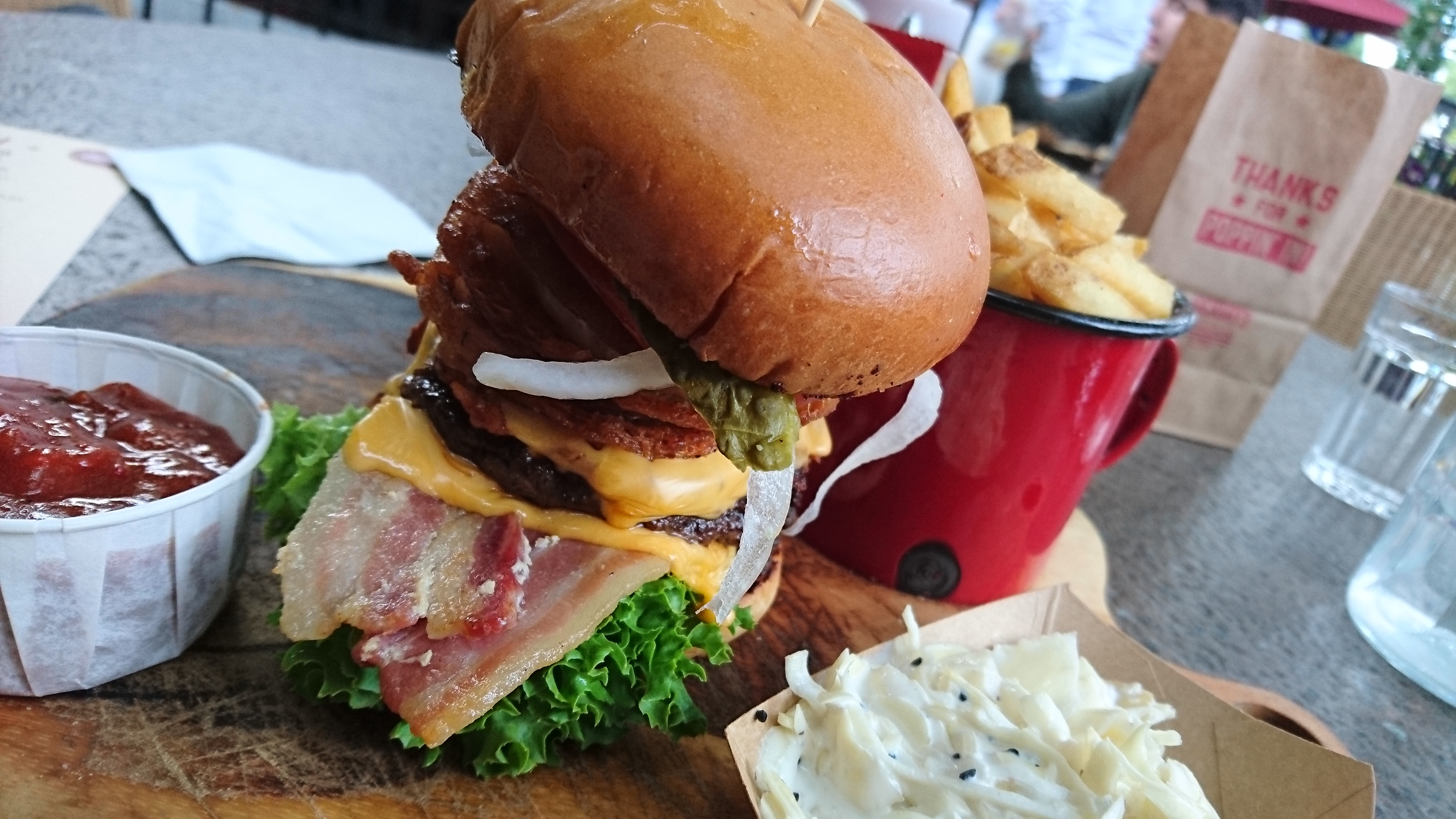 Inside the 2 creaking halves of your burger bun (skewered to keep everything together), you will find the following: 2 burgers, pulled pork, streaky bacon, gherkins, cajun onion rings, lettuce, tomato, their rather tasty house sauce and American cheese. This fullsome tribute to some kind of American culinary dream is accompanied by fries served in a mug and their very own coleslaw. This of course can be washed down with a refreshing chilled beer. Perfect.